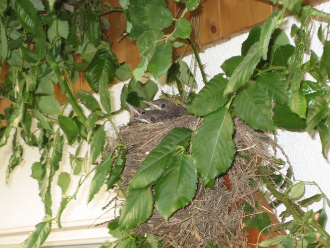 Na prelome júla/augusta si drozdi urobili hniezdo v ruziach na garázi a priviedli na svet tri mládatá. Odisli bez rozlucky..